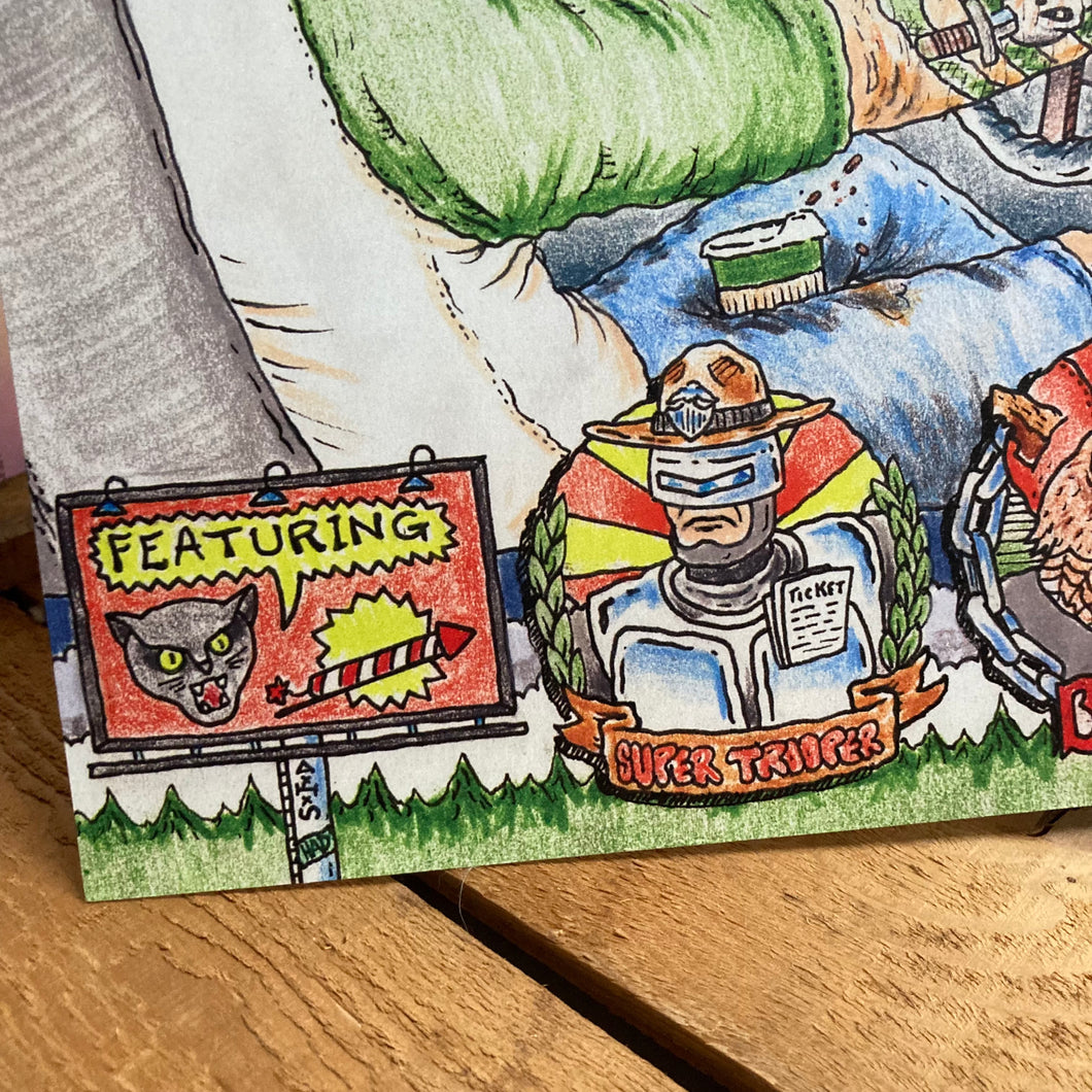 Tales from Interstate 95 is an original design by Ryan Wade and it's available in a limited edition of twenty signed & numbered prints. The scene depicts two outlaws settling some business.