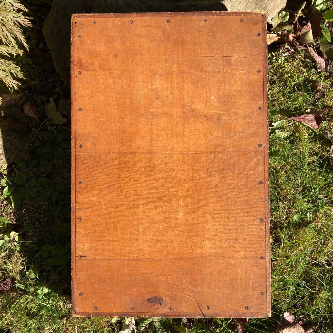 For sale is an antique wooden box with hand painted art on the front. The box is hinged and it has two eye hooks that help lock the box. There are multiple narrow sections in the box so you can organize your little collections. The box measures 17" tall, 11" wide, and 2" deep. The piece ships for free! Art by Ryan Wade.